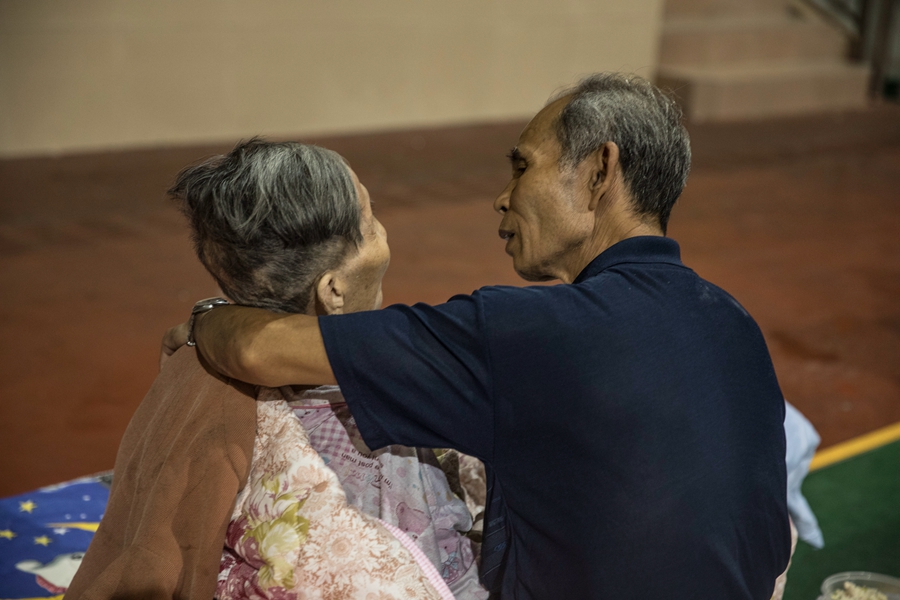 ????9月17日夜晚,陽春體育館的臨時安置點里,68歲的林文堅正在安慰72歲的老伴林麗珍。
