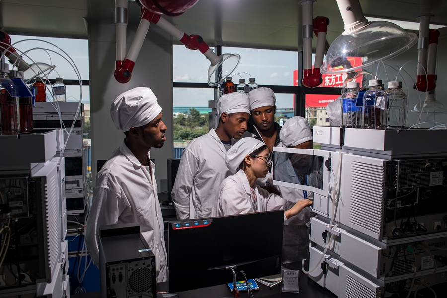 ????7月30日,埃塞俄比亞,首都亞的斯亞貝巴的東方工業園內一家中國制藥廠,27歲的中國員工汪紅梅為當地雇員講解液相色譜器械使用要領。整個實驗室共有4名中方員工和18名當地雇員。