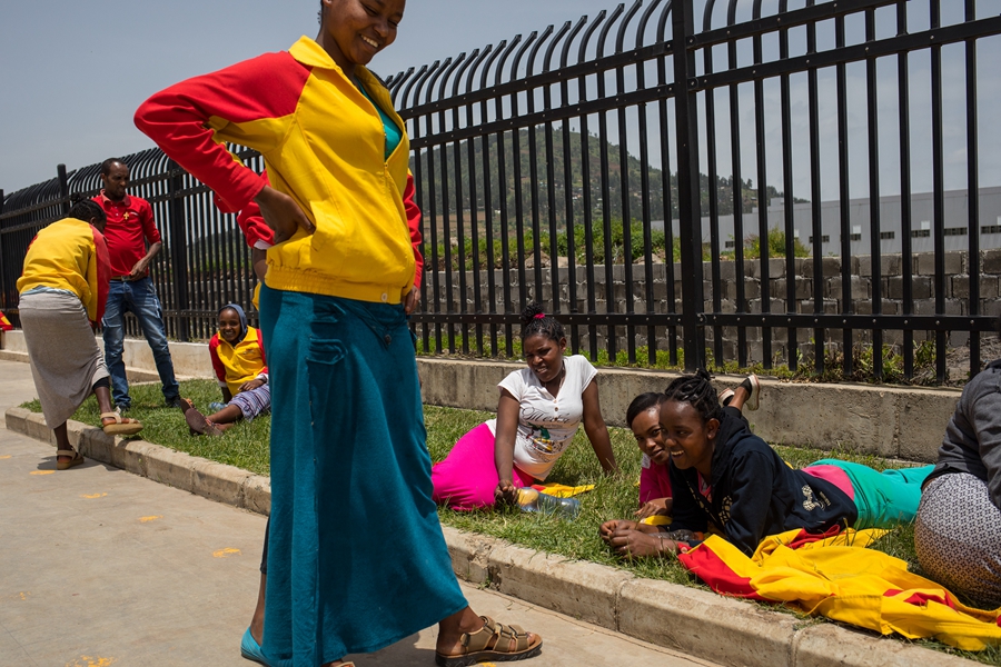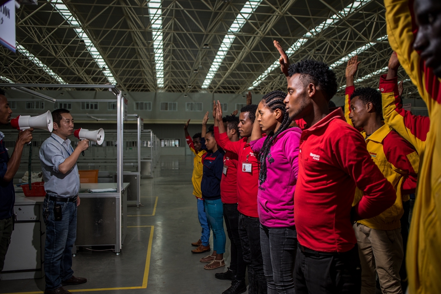 ????7月31日,埃塞俄比亞首都亞的斯亞貝巴的一家中國民營制鞋工廠——華堅鞋廠,下午的工作開始前,當地雇員用中文喊著“一二三四”列隊集合,合唱廠歌。