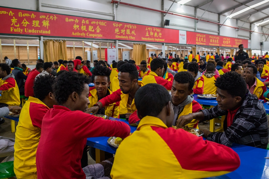 ????工人在食堂吃午餐,吃的是當地的特色主食英吉拉。
