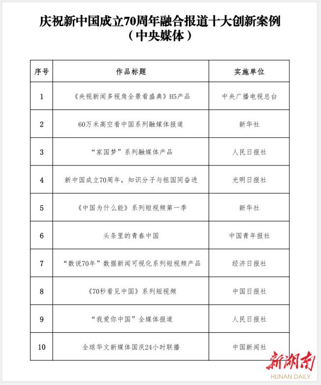中央廣播電視總臺、新華社、人民日報社、光明日報社、中國青年報社、經濟日報社、中國日報社、中國新聞社獲慶祝新中國成立 70 周年融合報道十大創新案例(中央媒體)。