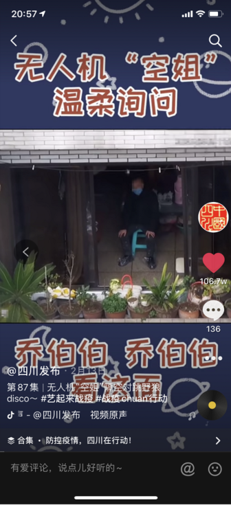 于是,我們迅速策劃,與瀘州市宣傳部門聯合進行無人機喊話宣傳,對部分獨居在家的群眾進行宣傳和慰問,并利用無人機進行跟拍。這其中,一位獨居在家的老人在回應無人機喊話時的“可愛”表現引起了我們的注意。