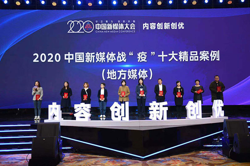 2020中國新媒體戰“疫”精品案例(地方媒體)獲獎單位代表上臺領獎。