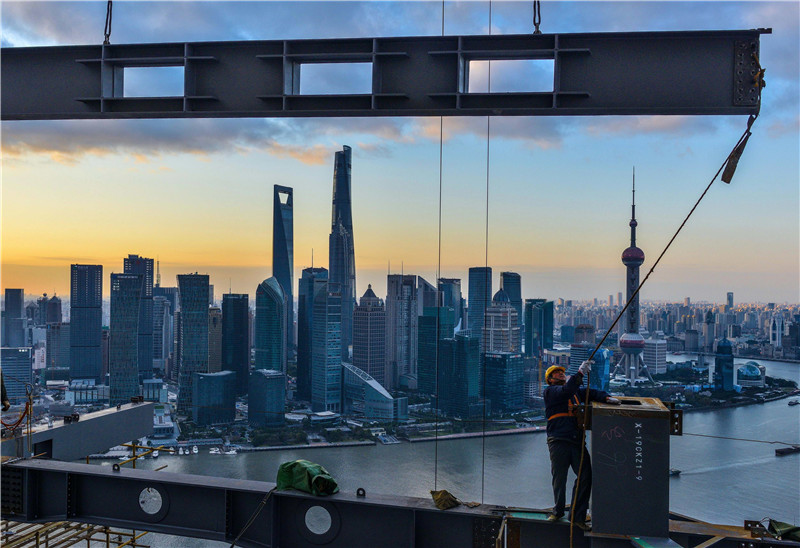 上海市普陀區銅川路高尚?領域建設工地(高度280米51層),工人在吊裝外框鋼結構主梁。(2018年10月13日攝)