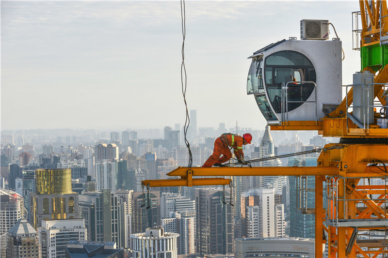 上海市靜安區蘇河灣中心大樓建設工地(高度204米43層),安裝工人在準備進行塔吊標準節頂升。(2020年10月25日攝)