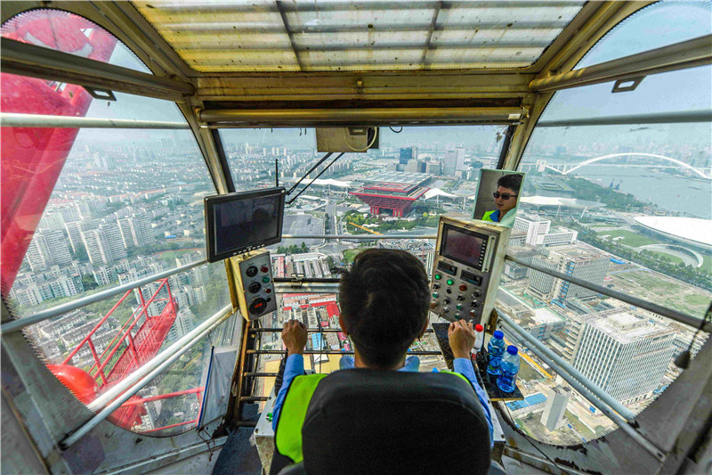 上海市浦東自由貿易區金磚國家新開發銀行總部大樓建設工地(高度150米30層),塔吊司機在世博園上空操控動臂塔吊。(2019年7月14日攝)