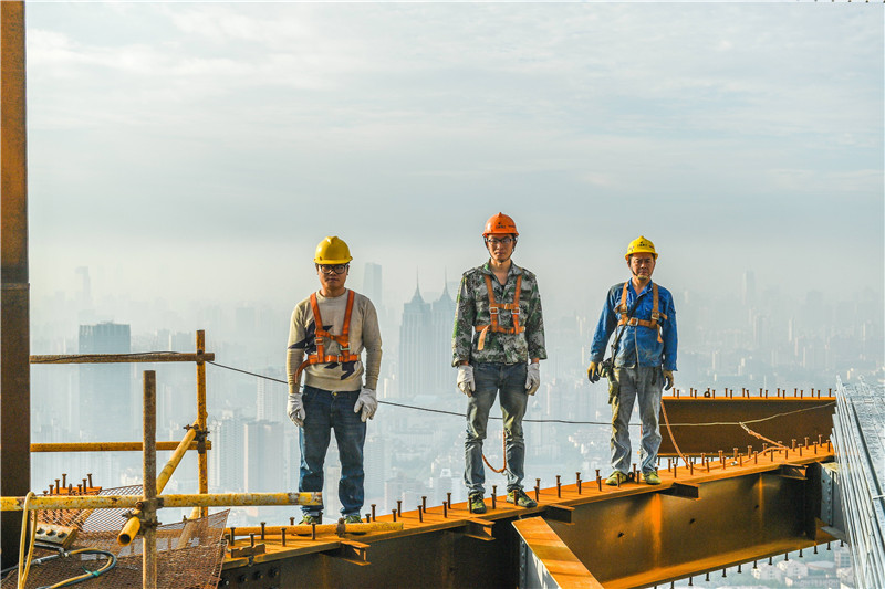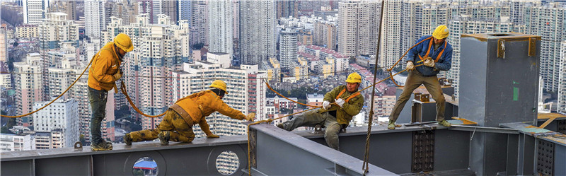 圖一:Raffles City on the North Bund, Tilan Bridge area, Hongkou district, Shanghai (263 meters high, 50 floors). Structure installation workers hoist steel components.