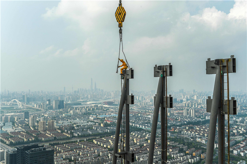 上海市浦東自由貿易區前灘中心大廈建設工地(高度280米56層),工人在進行大廈塔冠鋼結構吊裝。(2018年7月30日攝)