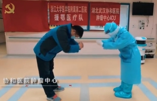 在浙江大學醫學院附屬第二醫院醫療隊支援的武漢協和醫院腫瘤中心ICU病區,特派記者捕捉到一個很有意味的鏡頭。治愈出院的病人出院前和醫生互行鞠躬禮。這個場景,跟一幅廣為流傳的經典照片十分相像。上世紀初,杭州廣濟醫院(現浙江大學醫學院附屬第二醫院)院長梅藤更先生查房時,面對小患者的鞠躬致謝順勢回禮的一瞬,也曾被攝影師抓拍下來。