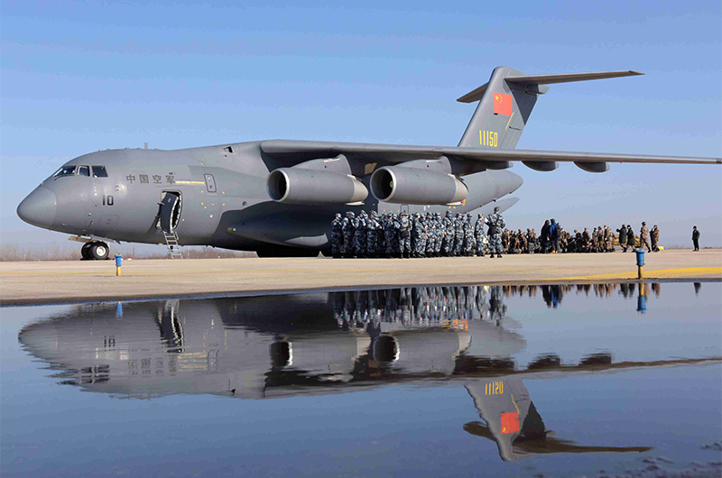 圖二:2月17日,軍隊支援武漢抗擊新冠肺炎疫情的醫護人員乘坐空軍運輸機抵達武漢天河機場。