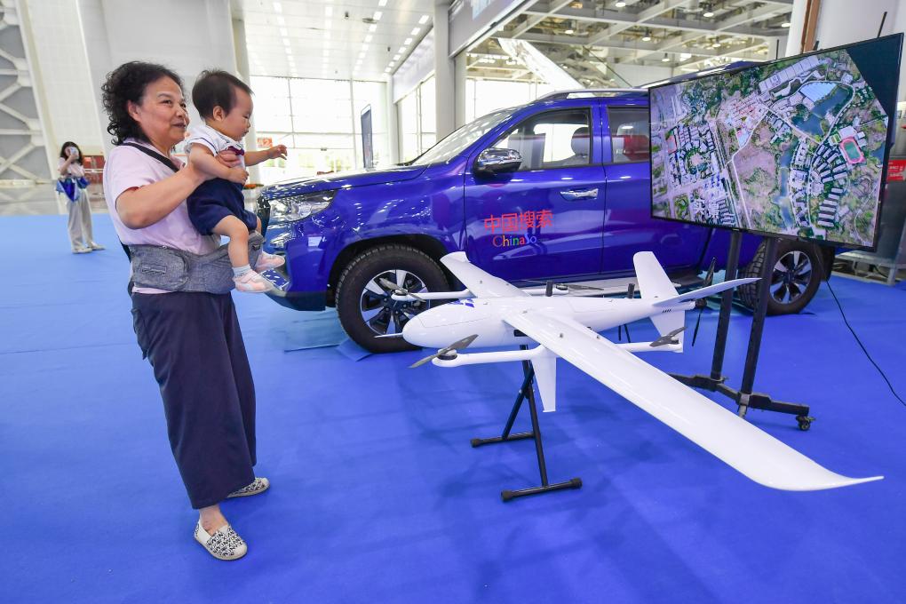 7月12日,在中國(guó)新媒體技術(shù)展的中國(guó)搜索展位,參觀者在參觀無(wú)人機(jī)設(shè)備。新華社記者 陳澤國(guó) 攝