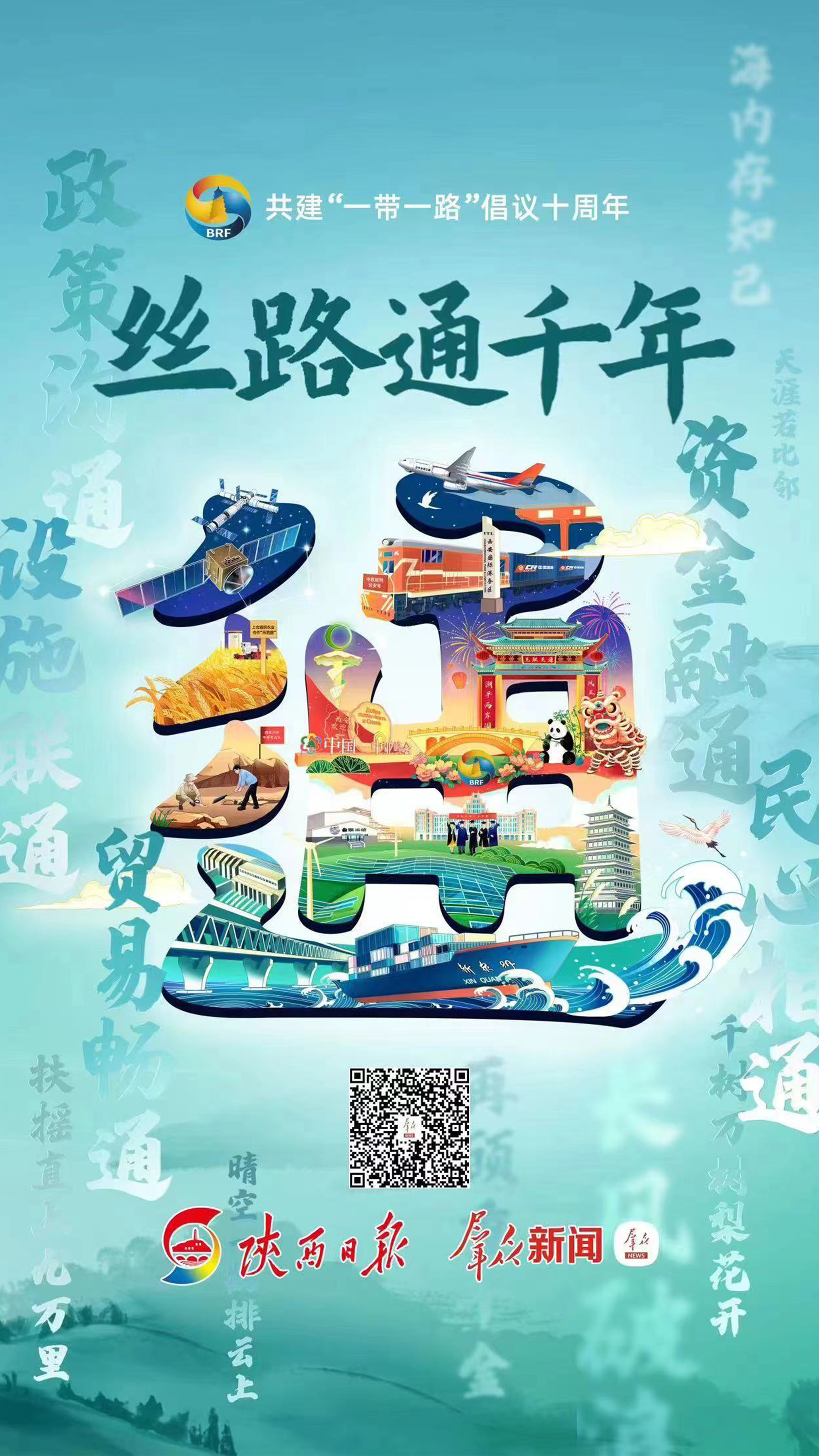 以唐朝詩(shī)人視角,“打卡”中國(guó)和“一帶一路”共建國(guó)家合作的重點(diǎn)項(xiàng)目。在手繪“通”字上聚合呈現(xiàn),將動(dòng)畫(huà)與繪畫(huà)相結(jié)合,配合場(chǎng)景轉(zhuǎn)換、音效設(shè)計(jì)等多種視聽(tīng)元素,凝聚成具有感染力的畫(huà)面,讓受眾穿越古今,沉浸式體驗(yàn)絲路之旅。