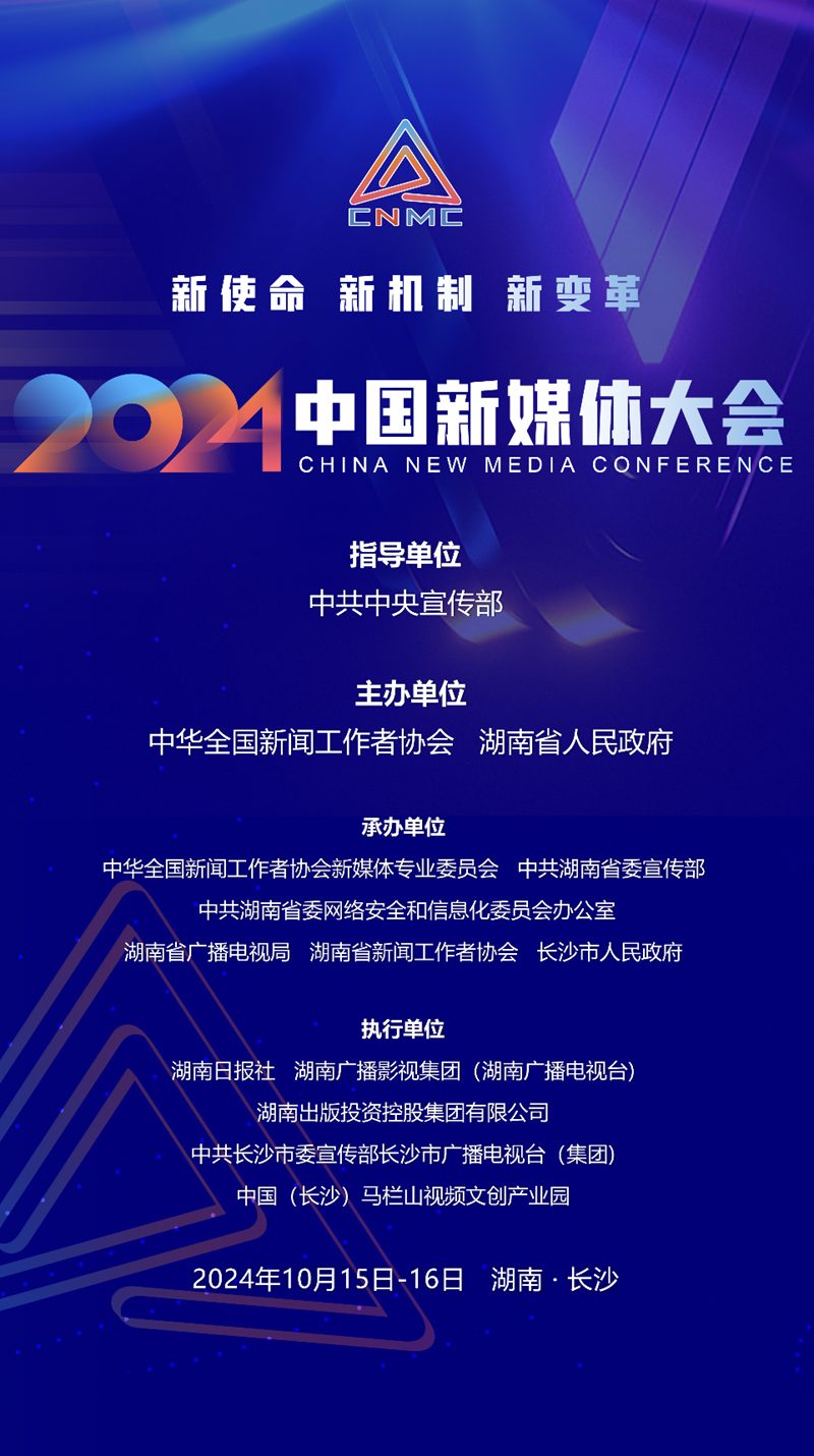 2024中國(guó)新媒體大會(huì)將于10月15日至16日在湖南長(zhǎng)沙召開。本屆大會(huì)由中央宣傳部指導(dǎo),中華全國(guó)新聞工作者協(xié)會(huì)、湖南省人民政府聯(lián)合主辦。大會(huì)以“新使命 新機(jī)制 新變革”為主題,全面展示新聞戰(zhàn)線堅(jiān)持以習(xí)近平文化思想為指導(dǎo),深入學(xué)習(xí)宣傳貫徹黨的二十屆三中全會(huì)精神,堅(jiān)定文化自信、堅(jiān)持守正創(chuàng)新,引領(lǐng)主流媒體推進(jìn)全媒體建設(shè)的新經(jīng)驗(yàn)新成就,積極引導(dǎo)新聞戰(zhàn)線牢記新時(shí)代文化使命,推進(jìn)系統(tǒng)性變革,構(gòu)建主流輿論新格局,為以中國(guó)式現(xiàn)代化全面推進(jìn)強(qiáng)國(guó)建設(shè)、民族復(fù)興偉業(yè)凝聚強(qiáng)大精神力量。