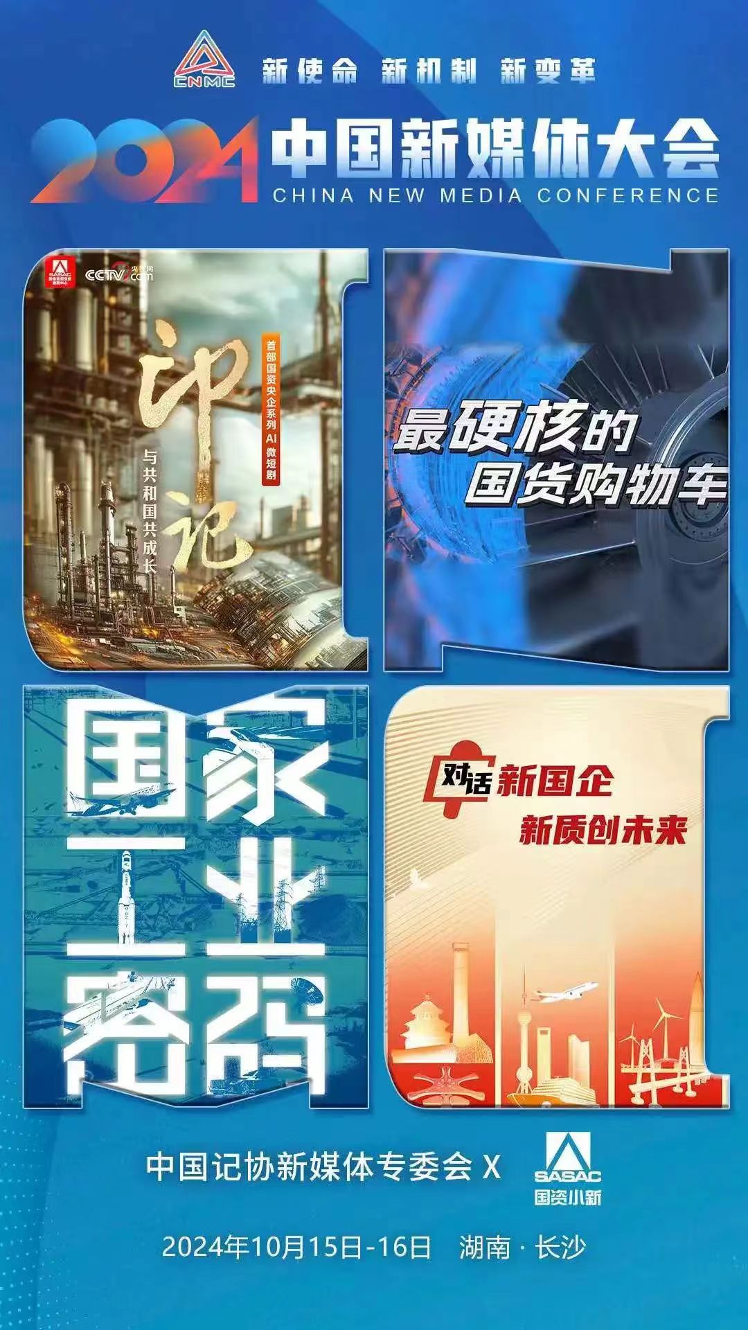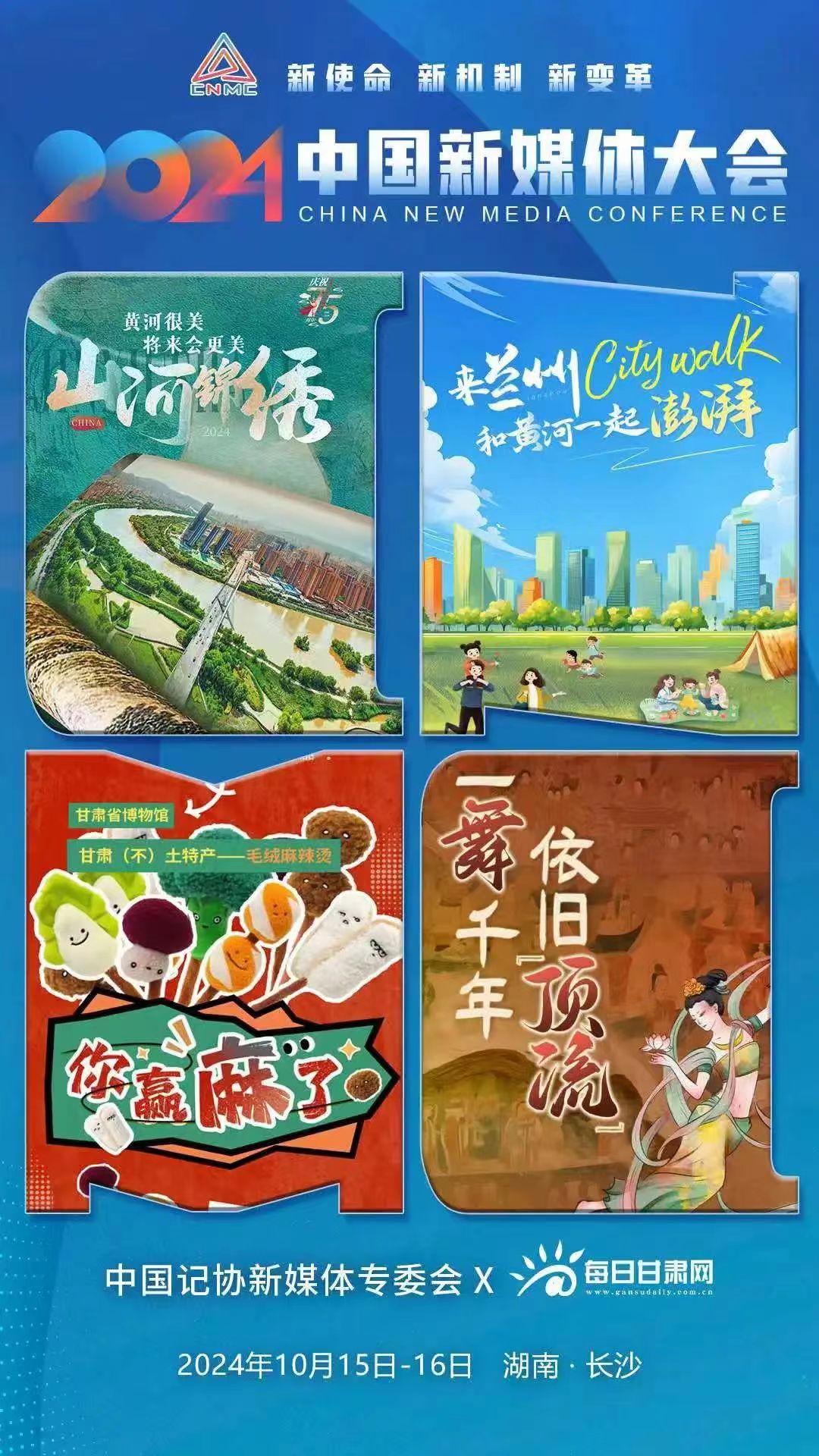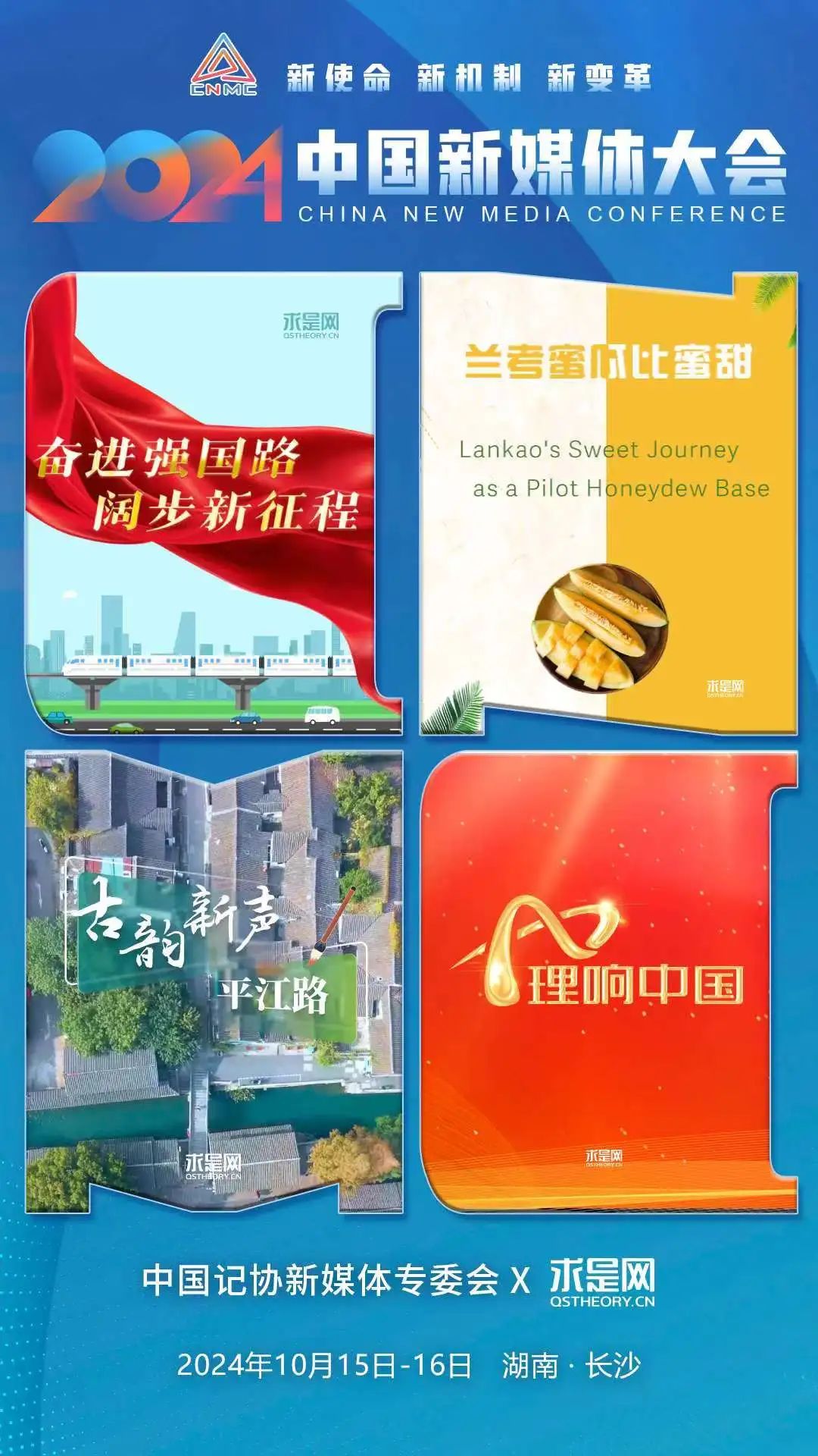 2024中國新媒體大會將于10月15日至16日在湖南長沙召開,中國記協新媒體專業委員會各成員單位紛紛推出“聯名海報”為大會預熱。