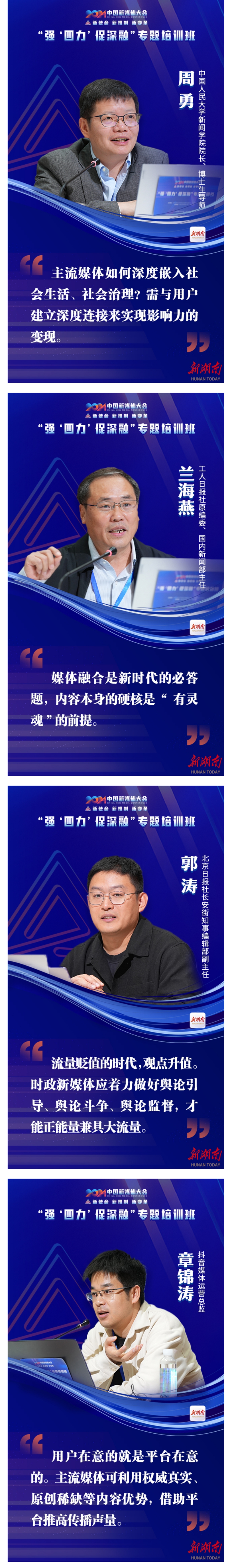 10月14日,2024中國新媒體大會“強‘四力’促深融”專題培訓班在長沙開班。來自高校、媒體的4位專家結合報道實踐和案例,圍繞系統性變革、職業發展、時政新媒體打造、內容創新、媒體運營等議題進行授課。一起來看看,誰的金句最戳中你?