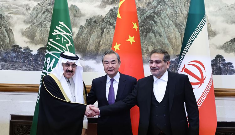 2023年3月10日,中共中央政治局委員、中央外辦主任王毅在北京主持沙特和伊朗對話閉幕式。沙特國務大臣兼國家安全顧問艾班、伊朗最高國家安全委員會秘書沙姆哈尼出席。