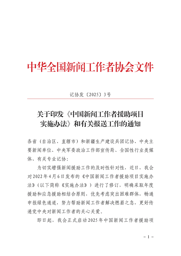 今天,中国记协正式启动2025年中国新闻工作者援助项目申报工作,各有关单位可按照新修订的《中国新闻工作者援助项目实施办法》,做好符合援助条件的新闻工作者的报送工作。