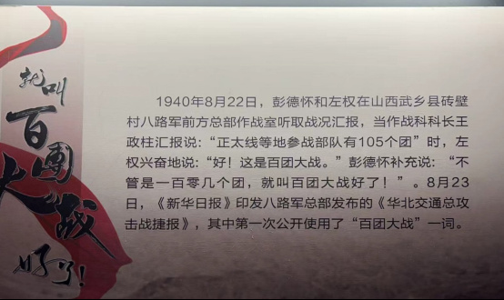 “百团大战”的名称是怎么来的?山西阳泉百团大战纪念馆的负责人秦茹介绍,战斗开始时,彭德怀和左权在山西武乡县砖壁村八路军前方总部作战室听取战况汇报,作战科科长王政柱汇报正太线等地参战部队有105个团,左权兴奋地说:“好!这是百团大战。”彭德怀补充说:“不管是一百零几个团,就叫百团大战好了!”
